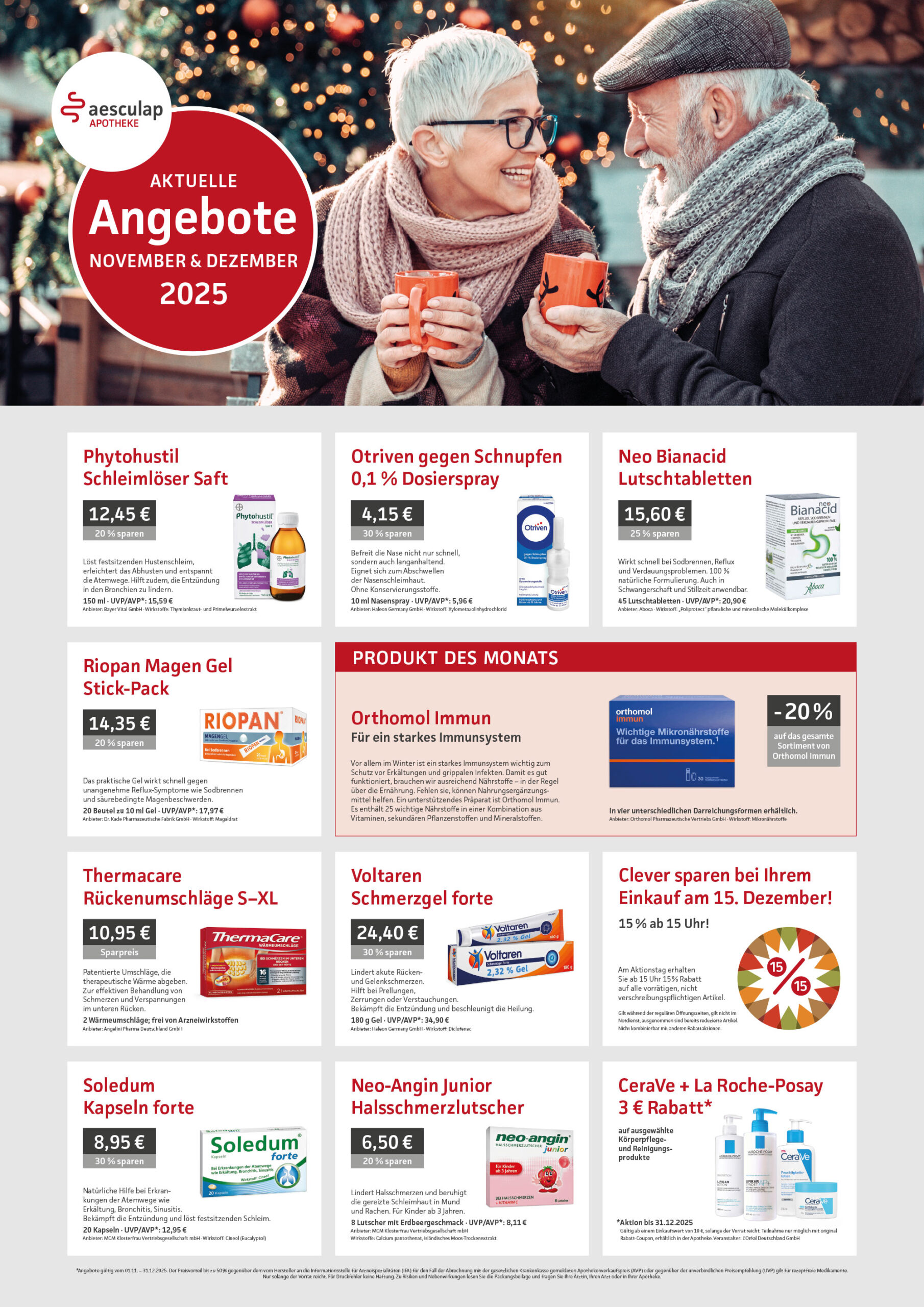 Am 15. Dezember können Sie bei Ihrem Besuch in der Apotheke sparen: 15 % ab 15 Uhr auf alle vorrätigen Artikel.*